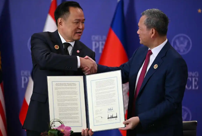 Cu?ng nga?y, Th? t??ng Thái Lan Anutin Charnvirakul va? Th? t??ng Campuchia Hun Manet ?ang tham d?? H?i ngh? C?p cao ASEAN l?n th? 47 diê?n ra ta?i Kuala Lumpur, Malaysia, bên lê? h??i nghi? hai bên ?a? ky? kê?t tuyên b??. Tuyên b?? bao g??m 4 tho?a thua?n ho?a bi?nh gi??a Tha?i Lan va? Campuchia la? loa?i bo? vu? khi? ha?ng n??ng, ra? pha? bom mi?n, tra?n a?p b?ng nho?m l??a ?a?o va? cu?ng nhau qua?n ly? biên gi??i.